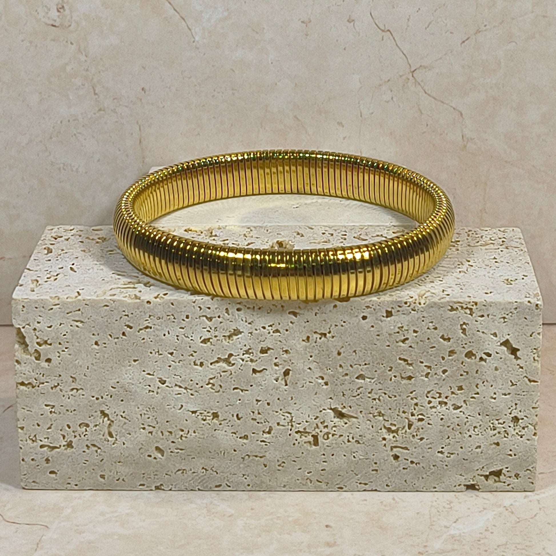 Flex Armband Ribbed RVS 10 mm – Goudkleurige Elastische Minimal Bracelet